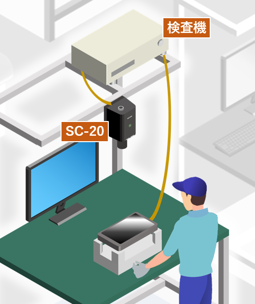此案例是SC-20通过与工厂设备的组合,不仅实现目视检查自动化,还减少了作业员不必要的步行移动的应用案例。