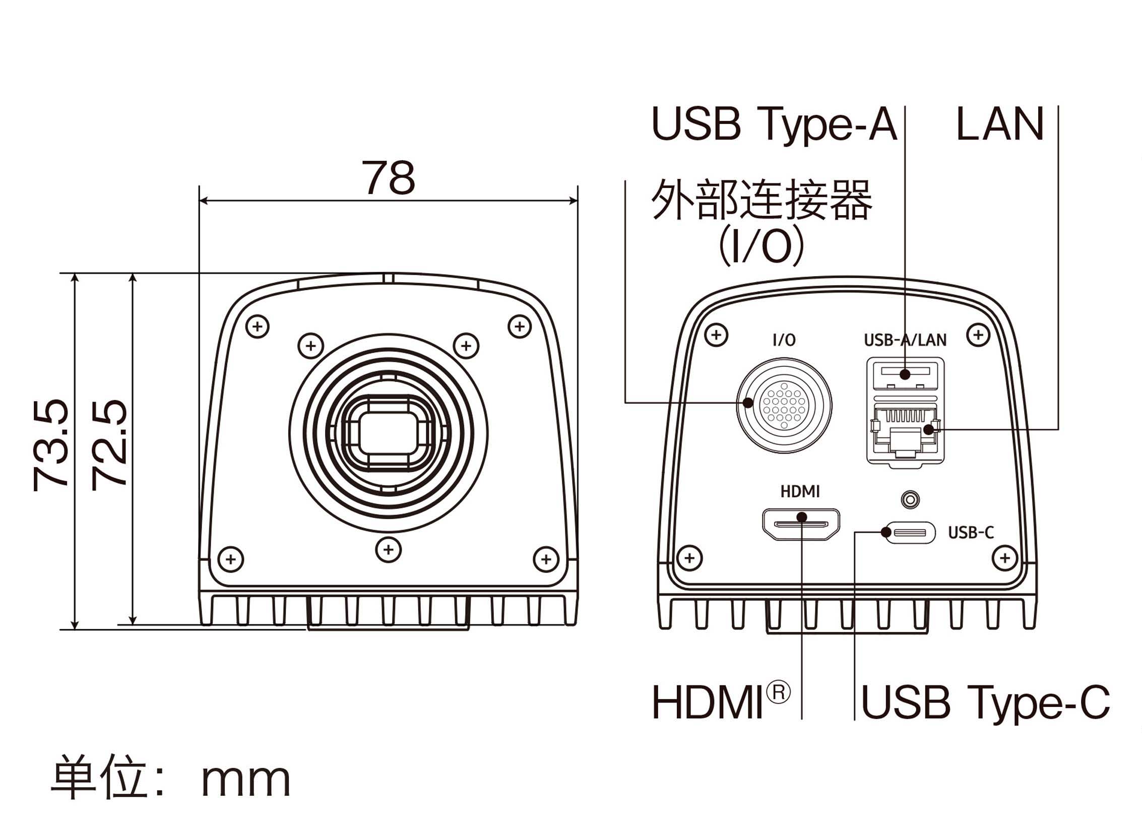 | 外形尺寸 | 78(W)×73.5(H)×117.9(D)mm(不含安装镜头和连接器部)(不含连接器部) | |