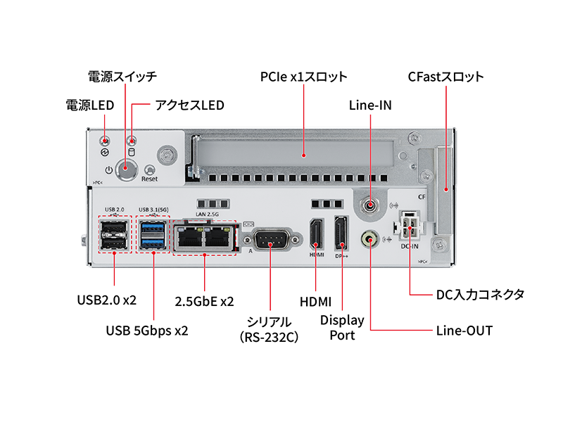| 拡張 | 1- PCIe ×1(Gen2)※1 1- M.2(Key M Type2242 SATA) 1- mini PCIe ※4 |
