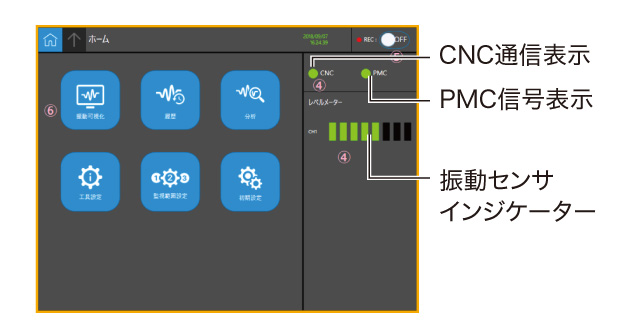 ファナック製のマシニングセンタ「ロボドリル」をはじめとしたファナック製CNC採用のマシニングセンタに取付可能※。振動センサーは主軸側面などに設置します。ロボドリルに取り付けた場合は、ロボドリルのメニュー画面上で振動の波形やFFT(Fast Fourier Transform)解析による周波数成分(スペクトログラム)、切削区間の表示が可能です。