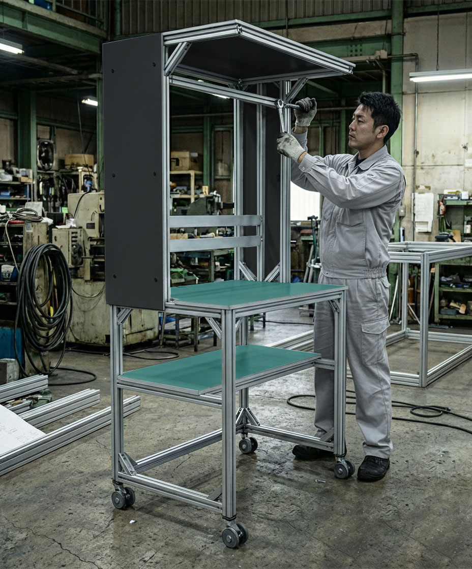 「作業台組立サービス」(有償メニュー)により弊社スタッフが現地へご訪問し、組立作業を実施いたします。